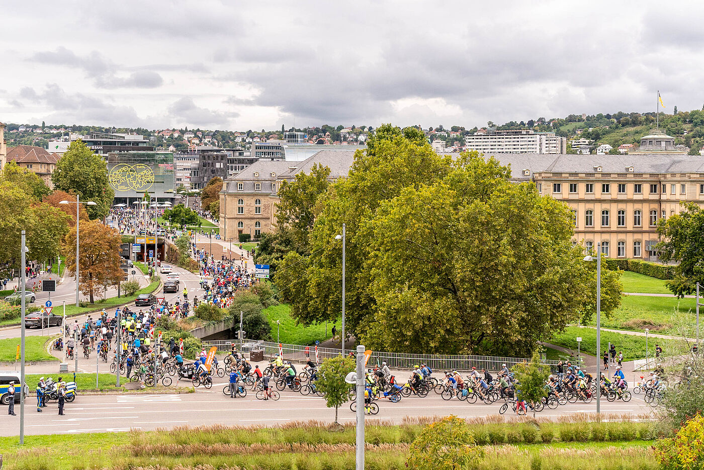 Sogar aus Freiburg, Karlsruhe, Heidelberg oder Schwäbisch Gmünd kamen Unterstützer*innen nach Stuttgart. Auf 12 polizeibegleiteten Strecken ging die Demo über die autofreien Bundesstraßen B10 und B14 bis zum Schlossplatz – endlich gab es mal richtig viel Platz fürs Fahrrad! Auch 350 Kinder der Kidical Mass Stuttgart radelten gut gelaunt zum Ziel, wo man schon seit vielen Jahren nicht mehr so viele Menschen mit Fahrrädern treffen konnte.